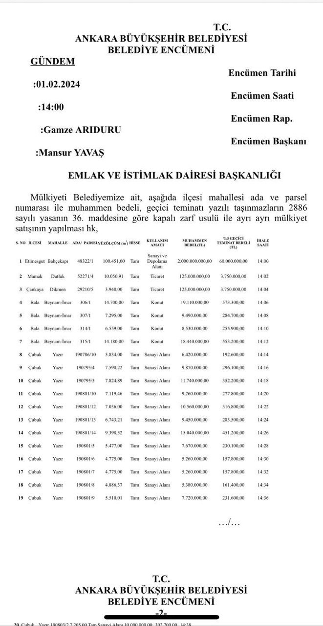Hatırlanacağı üzere Ankara Büyükşehir Belediyesi'nin (ABB) CHP'li Mansur Yavaş'ta olduğu son 5 yıllık süre içinde 81 ayrı taşınmazının piyasa değerinin altında bugünkü rayiçle yaklaşık 22 milyar liraya satılması şaibesini korurken 1 Şubat günü kapalı ihale yoluyla yapılan satışta 19 ayrı taşınmazın daha toplam 2,4 milyar lira bedelle satıldığı ortaya çıkmıştı.