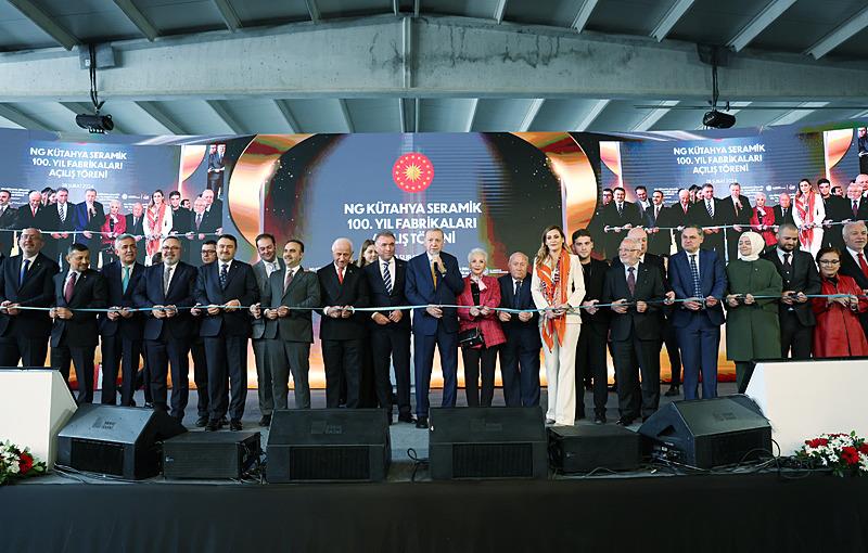 Törende daha sonra Erdoğan ve beraberindekiler kurdeleyi keserek NG Kütahya Seramik 100. Yıl Fabrikaları'nın açılışını yaptı ve fotoğraf çektirdi.