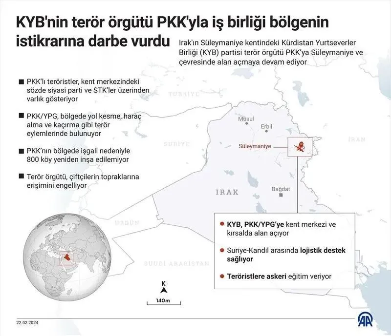 Irak'ın Süleymaniye kentindeki Kürdistan Yurtseverler Birliği (KYB) partisi terör örgütü PKK/YPG'ye kent merkezi ve kırsalda alan açarken, terör örgütü yol kesme, haraç alma ve kaçırma gibi terör eylemleriyle bölgenin istikrarı, güvenliği ve ekonomik kalkınmasına zarar veriyor. AA muhabirinin açık kaynaklardan derlediği bilgilere göre KYB, terör örgütü PKK'ya Süleymaniye ve çevresinde alan açmaya devam ediyor.