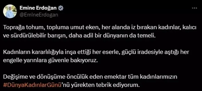 Emine Erdoğan mesajında şu ifadeleri kullandı; Toprağa tohum, topluma umut eken, her alanda iz bırakan kadınlar, kalıcı ve sürdürülebilir barışın, daha adil bir dünyanın da temeli.