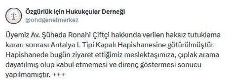 Terör örgütüne üye olmak suçundan tutuklanan avukat Şüheda Ronahi Çiftçi'nin İnsan Hakları Derneği (İHD) ve Çağdaş Hukukçular Derneği (ÇHD) Antalya Şube yöneticisi olduğu ortaya çıktı. Tutuklama kararı sonrasında ise Çiftçi'nin üye olduğu örgütlenmeler tarafından Antalya adliyesi önünde basın açıklaması yapıldığı öğrenildi. Dernek üyeleri, 3 avukatla savunma yapan Çiftçi'nin Kandil'de yazılan 16 sayfalık mikro notları cezaevine taşımasından habersiz gibi Antalya Adliyesi önünde yaptıkları açıklamada avukat Çiftçi'nin mesleki faaliyetlerinin suçlama konusu olduğunu iddia etti.
