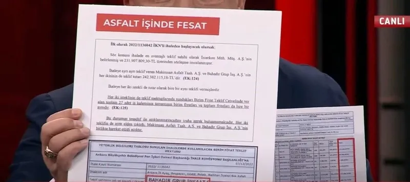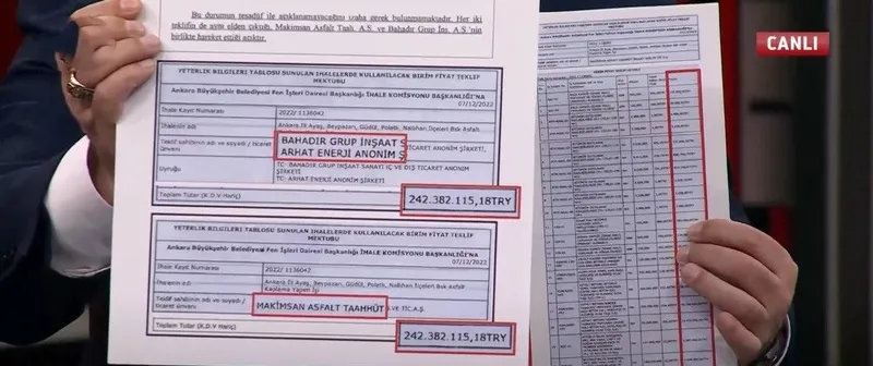 Cengiz Topel Yıldırım, programda yaptığı konuşmada, "Ankara Büyükşehir Belediyesi asfalt ihalesi yapıyor. Bu ihaleye katılan iki firmanın teklifi birebir aynıdır. Bahadır Grup İnşaat Arhat Enerji Anonim Şirketi'nin teklifi 242 milyon 382 bin 115 lira, Makimsan Asfalt'ın da teklifi 242 milyon 382 bin 155 lira yani kuruşuna kadar aynıdır. Bakın bu ihalede 27 tane iş kalemi var ve 27 iş kalemindeki birim fiyatlar dahi aynıdır."