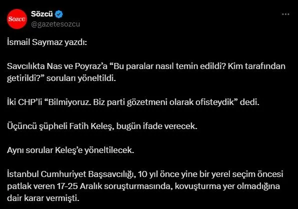 Bugünkü köşesinde 17-25 FETÖ kumpası ile balya balya sayıldığı gözler önünde olan CHP'deki 15 milyonluk kayıt dışı para skandalını karşılaştıran fondaş Sözcü yazarı İsmail Saymaz, "İstanbul Cumhuriyet Başsavcılığı, 10 yıl önce yine bir yerel seçim öncesi patlak veren 17-25 Aralık soruşturmasında, kovuşturma yer olmadığına dair karar vermişti." diyerek İmamoğlu'nu aklamaya çalıştı.