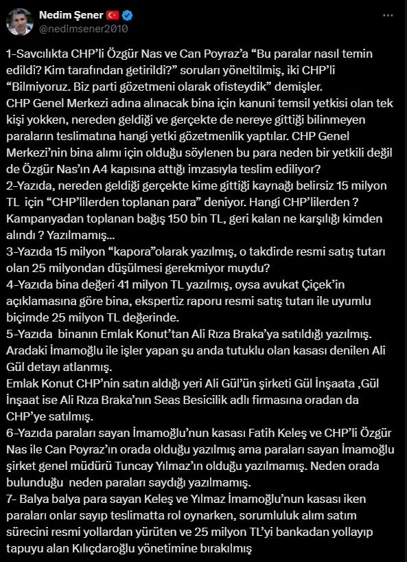 Binanın değerinin yazıda 41 milyon TL olduğunu ifade eden Şener, "Oysa avukat Çiçek'in açıklamasına göre bina, ekspertiz raporu resmi satış tutarı ile uyumlu biçimde 25 milyon TL değerinde. Yazıda binanın Emlak Konut'tan Ali Rıza Braka'ya satıldığı yazılmış. Aradaki İmamoğlu ile işler yapan şu anda tutuklu olan kasası denilen Ali Gül detayı atlanmış. Emlak Konut CHP'nin satın aldığı yeri Ali Gül'ün şirketi Gül İnşaata ,Gül İnşaat ise Ali Rıza Braka'nın Seas Besicilik adlı firmasına oradan da CHP'ye satılmış." değerlendirmesinde bulundu.