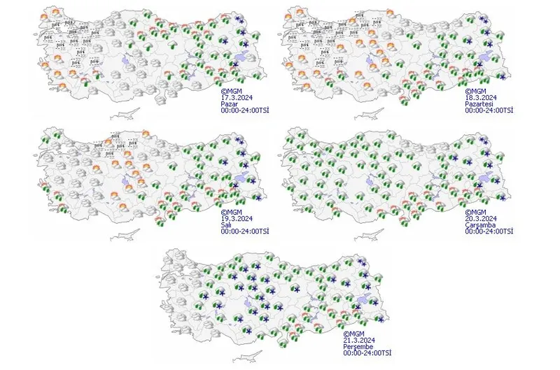 Meteoroloji Genel Müdürlüğü tarafından yapılan son tahminlere göre: Ülkemiz genelinin parçalı ve çok bulutlu, Akdeniz'in iç kesimleri, İç Anadolu'nun kuzeydoğusu, Orta ve Doğu Karadeniz, Doğu Anadolu (Van hariç), Güneydoğu Anadolu'nun kuzey ve doğusu, Kastamonu ve Sinop çevreleri, Kahramanmaraş, Antalya'nın iç ve batı kesimleri ile Akdeniz'in Toroslar kesiminin yağmur ve sağanak, İç Anadolu'nun kuzeydoğusu, Doğu Karadeniz'in iç kesimlerinin yüksekleri ile Doğu Anadolu'nun kuzey ve doğusunun yüksek kesimlerinin karla karışık yağmur ve yer yer kar yağışlı geçeceği tahmin ediliyor. Güneydoğu Anadolu'da toz taşınımı bekleniyor. Bu sabah ve gece saatlerinde Marmara ve iç kesimlerde yer yer pus ve sis hadisesinin, doğu kesimlerde buzlanma ve don olayı görüleceği tahmin ediliyor. Doğu Karadeniz'in iç kesimleri ile Doğu Anadolu'nun kuzey ve doğusunda çığ tehlikesi bulunmaktadır.