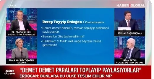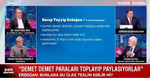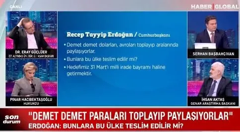 GENAR Araştırma Başkanı İhsan Aktaş, "Geçtiğimiz günlerde İstanbul Büyükşehir Belediyesi'nde çalışan bir yetkili arkadaşa sordum. Dedim ki bugünlerde ağalar ne yapıyorlar? İş yapmadıkları biliyoruz. Dedi ki hocam büyük büyük ihalelerle içeriksiz, biraz da böyle kontrolden çıkmış şekilde ihale yapıp dışarıya para çıkarıyorlar. Belediyenin şirketleri var. O şirketlerin usulünü, önceden orada çalışanlar biliyorlar. Malın değerini, ihalenin değerini bilen isimler" ifadelerini kullandı.