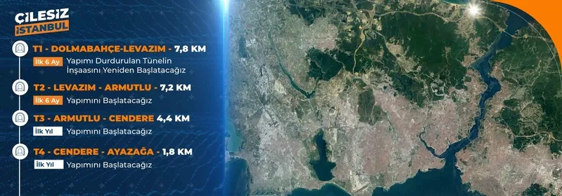 Çayırbaşı, Ayazağa, Levazım ve Dolmabahçe etabında 25,7 kilometrelik tünel projesi hızla tamamladığında, Büyükdere Caddesi ve sahil yoluna alternatif Dolmabahçe'den başlayıp Kilyos'a uzanan tünel zinciri hayata geçecek.