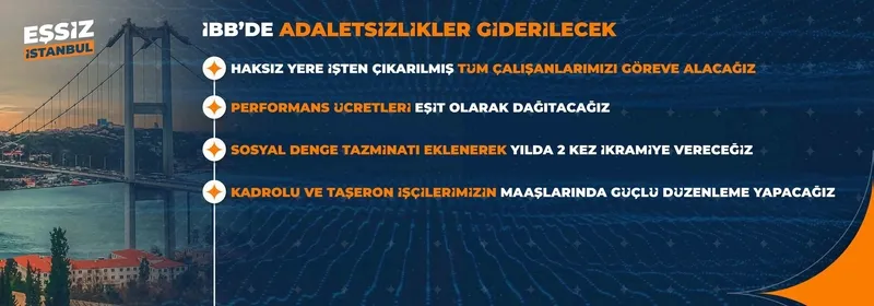 Kadrolu ve taşeron işçilerin maaşlarında güçlü bir düzeltme yapılacak; İBB personelinin 5 yıldır yaşadığı tüm adaletsizlikler hızlı bir şekilde giderilecek.