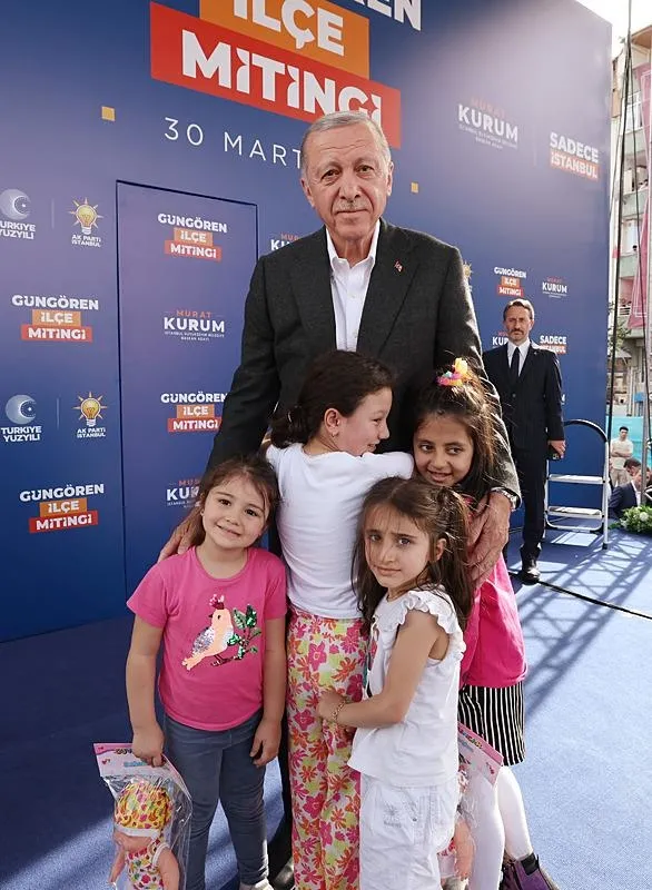 Erdoğan, katılımcılara, "Bunun için Güngören'den öyle bir ses verin ki iki tarafta da duymayan kalmasın. Hazır mıyız Güngören? Yüz ölçümü küçük, yüreği kocaman Güngören. 31 Mart'ta Türkiye Yüzyılı şehirleri için hazır mıyız? 31 Mart'ta Türkiye Yüzyılı şehirleri için kararlı mıyız? 31 Mart'ta gerçek belediyeciliği tercih ediyor muyuz? Bunun için seçim gününe kadar kapı kapı dolaşmaya var mıyız? Hanımlar var mıyız? Gençler var mıyız? Güngören'le birlikte İstanbul haritasının tamamını Cumhur İttifakı'nın renkleriyle boyamaya var mıyız? Büyükşehir'de Murat Kurum diyor muyuz? Güngören'de Bünyamin Demir diyor muyuz?" sorularını yöneltti. Mitinge katılanların "Evet" cevabı üzerine Erdoğan, "Rabbim hepinizden razı olsun." dedi.