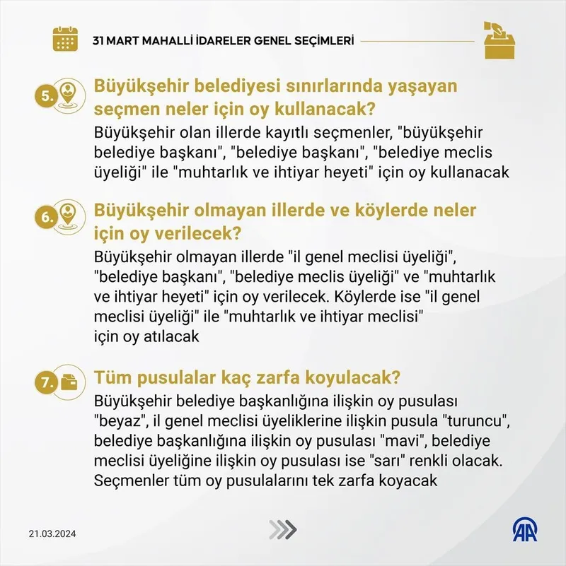 Büyükşehir belediye başkanlığına ilişkin oy pusulası "beyaz", il genel meclisi üyeliklerine ilişkin pusula "turuncu", belediye başkanlığına ilişkin oy pusulası "mavi", belediye meclisi üyeliğine ilişkin oy pusulası ise "sarı" renkli olacak. Oy pusulaları tek zarfa konulacak.