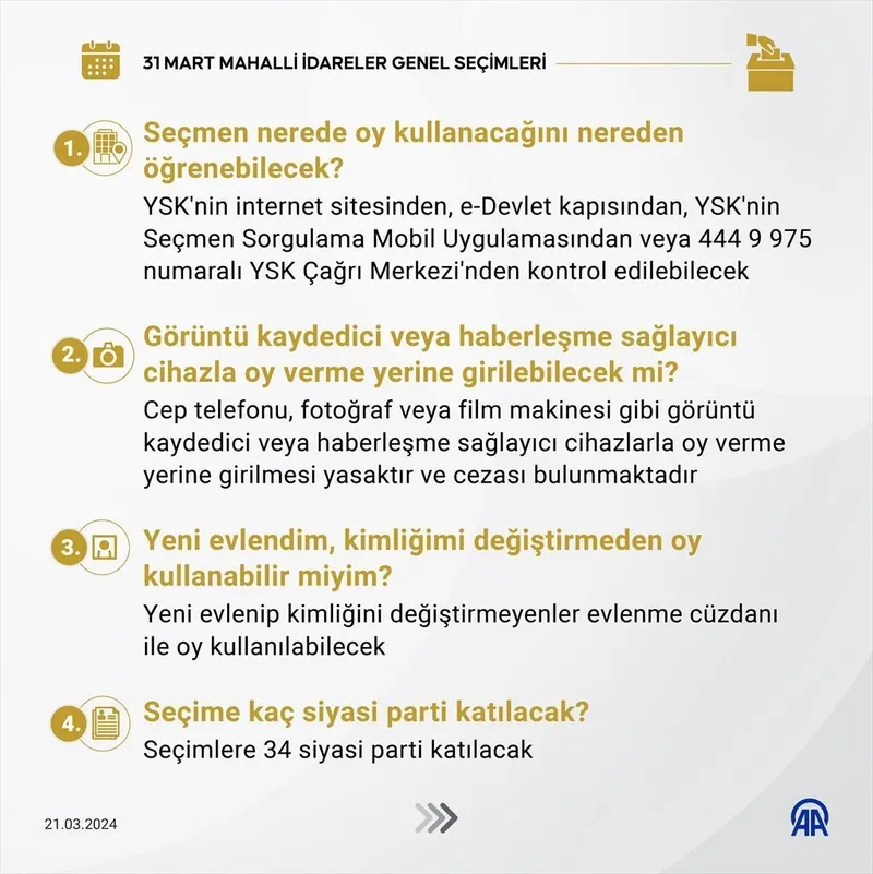 Türkiye, 5 yıl boyunca görev yapacak yerel yöneticileri seçmek için sandık başında. Seçmenler, nerede oy kullanacağını seçmen bilgi kağıdından veya internetten öğrenebilecek. Seçmenin üzerinde vatandaşlık numarası olan kimlik belgesini bulundurması gerekecek, cep telefonuyla kabine girilmeyecek, oy pusulasına mühür dışında işaret konulmayacak. Oy vermenin bitiş saati geldiği halde sandık başında oylarını vermek üzere bekleyen seçmenler varsa, sandık kurulu başkanı seçmenleri saydıktan ve kimliklerini aldıktan sonra sırayla oylarını kullanmalarına izin verecek, oy verme saati bittikten sonra gelen seçmen oy kullanamayacak. İşte 5 adımda oy kullanma rehberi.