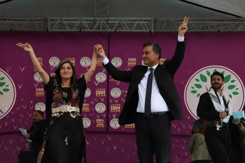 DEM Parti Siirt Milletvekili Sabahat Erdoğan Sarıtaş ile kesin olmayan sonuçlara göre DEM Parti'den Siirt Belediye Başkanı seçilen Sofya Alağaş ve DEM Parti İl Başkanı Eşref Tekin'in de bulunduğu grup, Güres Caddesi'ne kadar yürüdü.