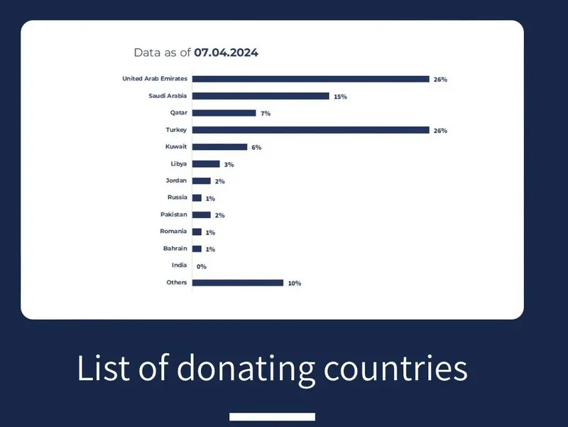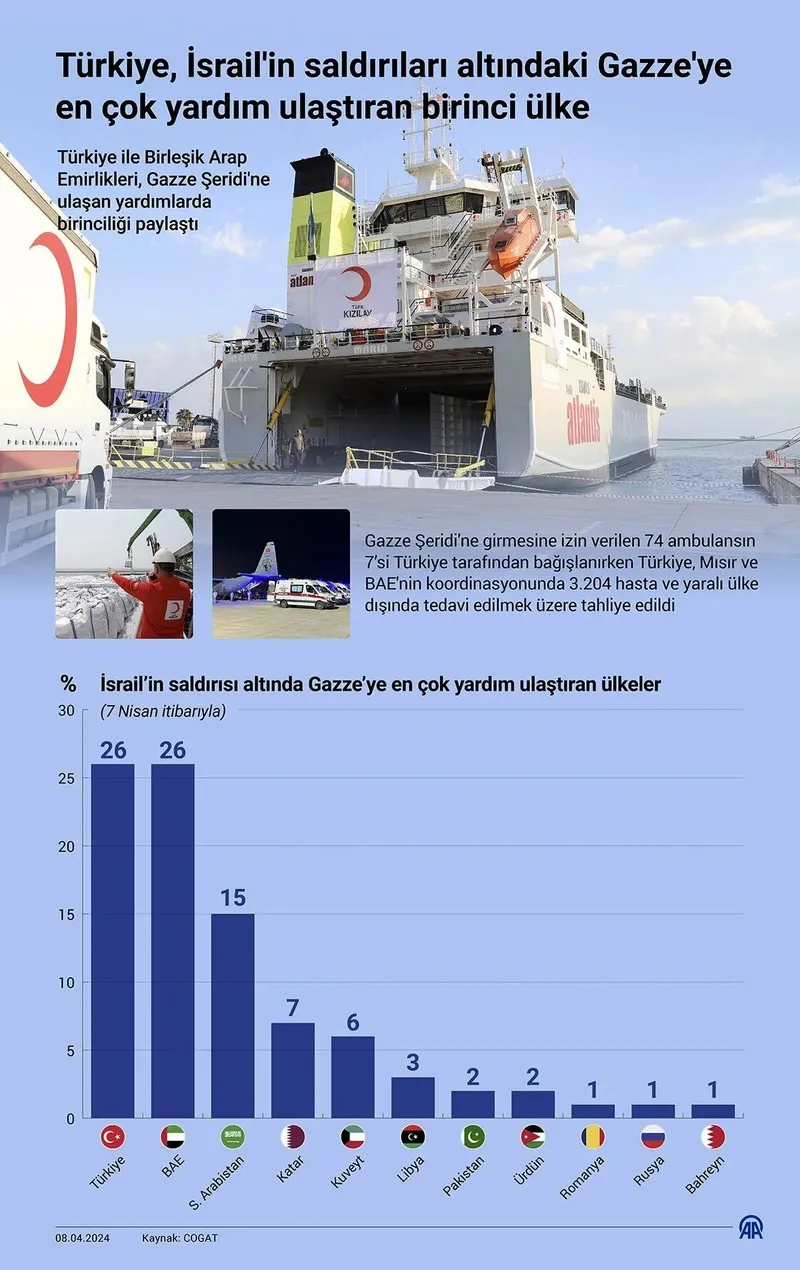 COGAT'ın 7 Nisan verilerine göre, İsrail'in engellemelerinin devam ettiği ve girişine çok az miktarda izin verdiği yardımlarda yüzde 26'lık insani yardım oranıyla Türkiye ilk sırada yer aldı. Birleşik Arap Emirlikleri (BAE) de yüzde 26'lık oranla birinciliği paylaştı.