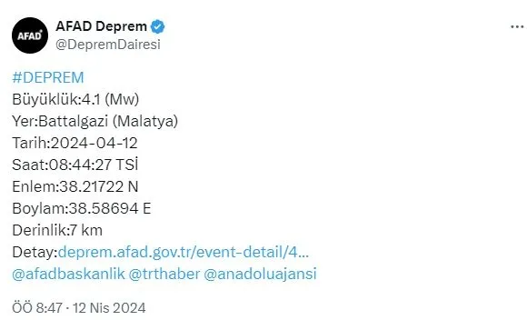 Afet ve Acil Durum Yönetimi (AFAD) Başkanlığının internet sitesinde yer alan bilgiye göre, merkez üssü Battalgazi ilçesi olan 4,1 büyüklüğünde sarsıntı kaydedildi.