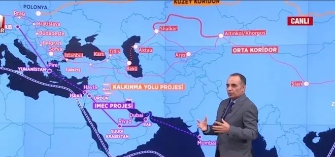 Şu anda Kızıldeniz üzerinden uygulanan bir koridor var. Suveyş Kanalı'na kadar giden ve 45-50 günü bulan bir seyirden bahsediliyor. Burası hem maliyeti artırıyor hem de süreyi uzatıyor. Kalkınma Yolu Koridoru ile Basra Körfezi'nde başlayan ve Türkiye'yi içine alan kara ve deniz ve demiryolu projesini konuşuyoruz. Türkiye'ye giriş yaptıktan sonra Mersin Limanı'na gelen oradan deniz yolu ile devam eden bir güzergahtan bahsediyoruz.