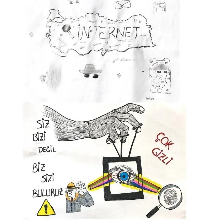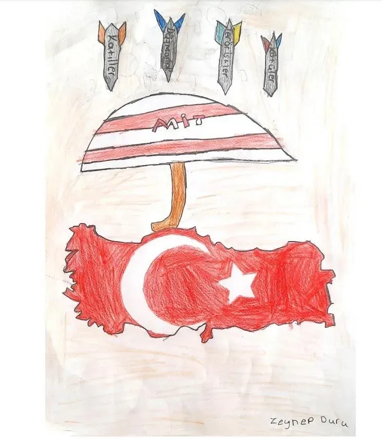 Zeynep Duru'nun, Türkiye haritası üzerine çizdiği MİT şemsiyesi ile füze saldırılarından ülkeyi koruduğunu anlatan resmi de dikkat çekti.
