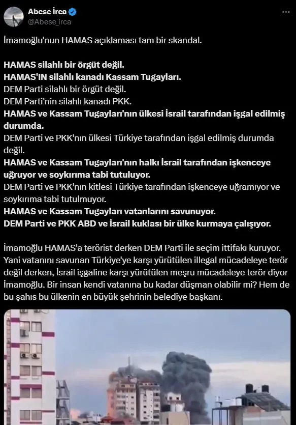 İmamoğlu'nun Hamas'ı terör örgütü ilan ederken seçimlerde terörün siyasi ayağı DEM Parti ile ittifak yaptığına dikkat çeken "Abese İrca" isimli sosyal medya kullanıcısı CHP'li İBB Başkanı'na sert tepki gösterdi.