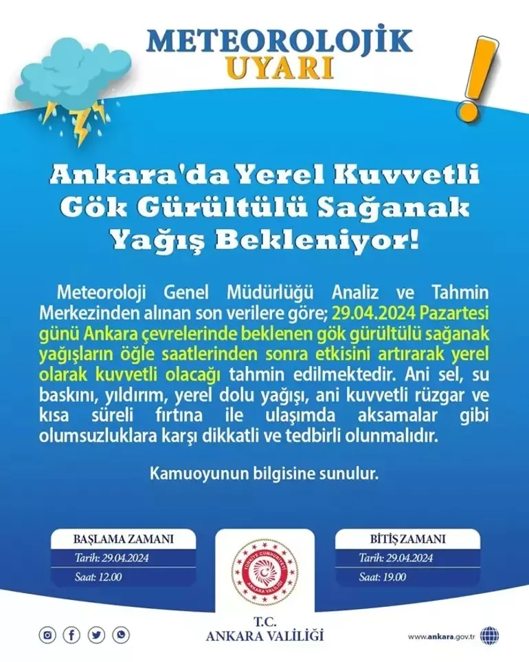 Ankara Valiliği'nin sosyal medya hesabından yapılan paylaşımda, Meteoroloji Genel Müdürlüğü Ankara Bölge Tahmin ve Erken Uyarı Merkezi verilerine göre 29 Nisan Pazartesi günü Ankara ve çevresinde etkili olacak gök gürültülü sağanak yağışın öğle saatlerinden sonra etkisini artırarak yerel olarak kuvvetli olmasının beklendiği belirtildi. Valilik, ani sel, su baskını, yıldırım, yerel dolu yağışı, ani kuvvetli rüzgar ve kısa süreli fırtına ile ulaşımda aksamalar gibi olumsuzluklara karşı dikkatli ve tedbirli olunması uyarısunda bulundu.