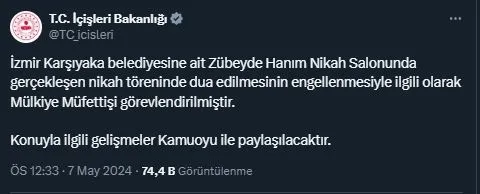 Konuya ilişkin İçişleri Bakanlığından da açıklama geldi. Bakanlıktan yapılan açıklamada, "zmir Karşıyaka belediyesine ait Zübeyde Hanım Nikah Salonunda gerçekleşen nikah töreninde dua edilmesinin engellenmesiyle ilgili olarak Mülkiye Müfettişi görevlendirilmiştir. Konuyla ilgili gelişmeler Kamuoyu ile paylaşılacaktır." denildi.
