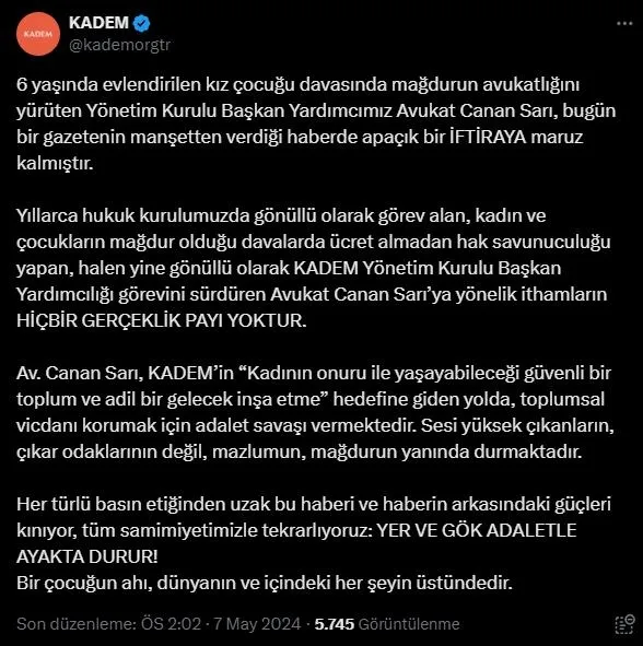 Kadın ve Demokrasi Derneği, 6 yaşında evlendirilen kız çocuğu davasında mağdurun avukatlığını yürüten Yönetim Kurulu Başkan Yardımcısı Avukat Canan Sarı ile ilgili sosyal medya hesabında bir açıklama yaptı. Yapılan açıklamada, "Avukat Canan Sarı’ya yönelik ithamların hiçbir gerçeklik payı yoktur." denildi.
