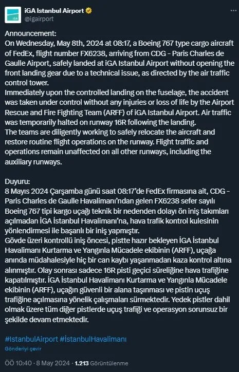 "8 Mayıs 2024 Çarşamba günü saat 08:17'de FedEx firmasına ait, CDG - Paris Charles de Gaulle Havalimanı'ndan gelen FX6238 sefer sayılı Boeing 767 tipi kargo uçağı teknik bir nedenden dolayı ön iniş takımları açılmadan İGA İstanbul Havalimanı'na, hava trafik kontrol kulesinin yönlendirmesi ile başarılı bir iniş yapmıştır. Gövde üzeri kontrollü iniş öncesi, pistte hazır bekleyen İGA İstanbul Havalimanı Kurtarma ve Yangınla Mücadele ekibinin (ARFF), uçağa anında müdahalesiyle hiç bir can kaybı yaşanmadan kaza kontrol altına alınmıştır. Olay sonrası sadece 16R pisti geçici süreliğine hava trafiğine kapatılmıştır.