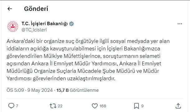 Bakanlığın sosyal medya hesabından yapılan açıklamada şu ifadelere yer verildi: "Ankara'daki bir organize suç örgütüyle ilgili sosyal medyada yer alan iddiaların açıklığa kavuşturulabilmesi için İçişleri Bakanlığımızca görevlendirilen Mülkiye Müfettişlerince, soruşturmanın selameti açısından Ankara İl Emniyet Müdür Yardımcısı M.Ç., Ankara İl Emniyet Müdürlüğü Organize Suçlarla Mücadele Şube Müdürü K.G.Ö. ve Müdür Yardımcısı Ş.D. görevlerinden uzaklaştırılmışlardır."