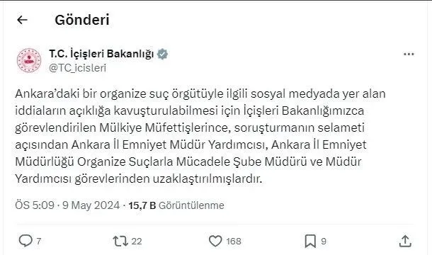 Bakanlığın sosyal medya hesabından yapılan açıklamada şu ifadelere yer verildi: "Ankara'daki bir organize suç örgütüyle ilgili sosyal medyada yer alan iddiaların açıklığa kavuşturulabilmesi için İçişleri Bakanlığımızca görevlendirilen Mülkiye Müfettişlerince, soruşturmanın selameti açısından Ankara İl Emniyet Müdür Yardımcısı M.Ç., Ankara İl Emniyet Müdürlüğü Organize Suçlarla Mücadele Şube Müdürü K.G.Ö. ve Müdür Yardımcısı Ş.D. görevlerinden uzaklaştırılmışlardır."