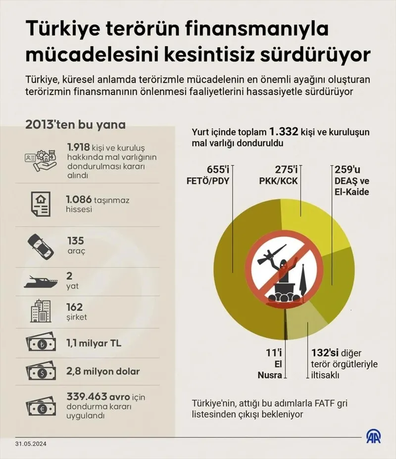 Türkiye’nin en büyük milli güvenlik sorunu olan PKK ve FETÖ gibi terör örgütleriyle mücadele her alanda devam ediyor. 2013 yılından bu yana terör iltisaklı 1918 kişi ve kuruluşun mal varlığı donduruldu. Türkiye'de bu kararlar sonucu 1086 taşınmaz hisse ve payı, 135 araç, 2 yat ve 162 şirket ile 1 milyar 105 milyon 818 bin 451 lira, 2 milyon 781 bin 123 dolar ve 339 bin 463 avro için dondurma kararı uygulandı.