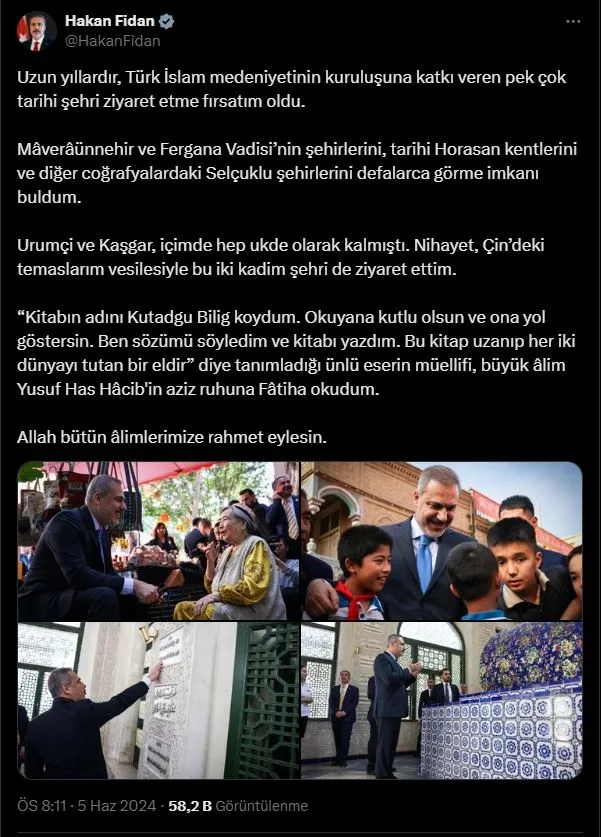 Dışişleri Bakanı Hakan Fidan'ın Çin'deki temasları kapsamında, Çin'in Sincan Uygur Özerk Bölgesi'ndeki Kaşgar şehrinde Yusuf Has Hacib Türbesi ve Iydgah Camii’ni ziyaret etti. Bakan Fidan, Urumçi ve Kaşgar ziyaretine ilişkin yaptığı paylaşımda "Urumçi ve Kaşgar, içimde hep ukde olarak kalmıştı. Nihayet, Çin’deki temaslarım vesilesiyle bu iki kadim şehri de ziyaret ettim." ifadelerini kullandı.