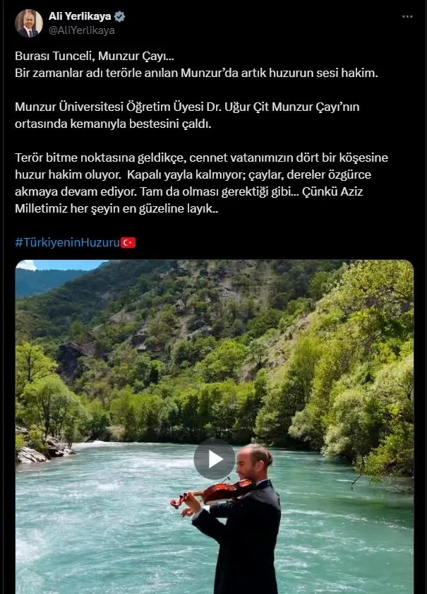 Bir zamanlar terörle anılan Munzur'da artık huzur hakim. Tunceli'de yaşayan akademisyen Uğur Çit, Munzur Vadisi Milli Parkı'nın güzelliğine dikkati çekmek amacıyla Munzur Çayı'nın ortasında keman çaldı. Görüntüleri sosyal medyadan paylaşan İçişleri Bakanı Ali Yerlikaya, "Terör bitme noktasına geldikçe, cennet vatanımızın dört bir köşesine huzur hakim oluyor. Kapalı yayla kalmıyor; çaylar, dereler özgürce akmaya devam ediyor. Tam da olması gerektiği gibi… Çünkü Aziz Milletimiz her şeyin en güzeline layık.." dedi.