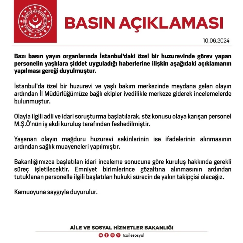 "Olayla ilgili adli ve idari soruşturma başlatılarak, söz konusu olaya karışan personel M.Ş.Ö'nün iş akdi kuruluş tarafından feshedilmiştir. Yaşanan olayın mağduru huzurevi sakinlerinin ise ifadelerinin alınmasının ardından sağlık muayeneleri yapılmıştır. Bakanlığımızca başlatılan idari inceleme sonucuna göre kuruluş hakkında gerekli süreç işletilecektir. Emniyet birimlerince gözaltına alınmasının ardından tutuklanan personelle ilgili başlatılan hukuki sürecin de yakın takipçisi olacağız. Kamuoyuna saygıyla duyurulur."