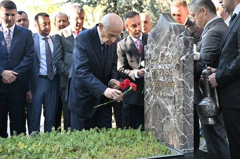 Kur'an-ı Kerim tilavetinin ardından Bahçeli, Türkeş'in kabrine karanfil bıraktı, bakır ibrikle su döktü.