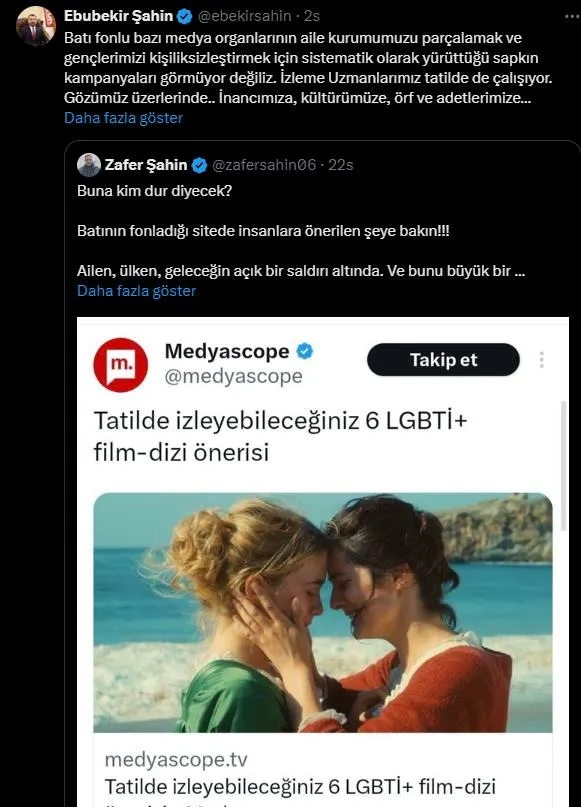 "Batı fonlu bazı medya organlarının aile kurumumuzu parçalamak ve gençlerimizi kişiliksizleştirmek için sistematik olarak yürüttüğü sapkın kampanyaları görmüyor değiliz. Gözümüz üzerlerinde... İnancımıza, kültürümüze, örf ve adetlerimize aykırı yapımlar ve bunları pazarlayan işbirlikçileriyle mücadelemiz aralıksız devam edecektir."