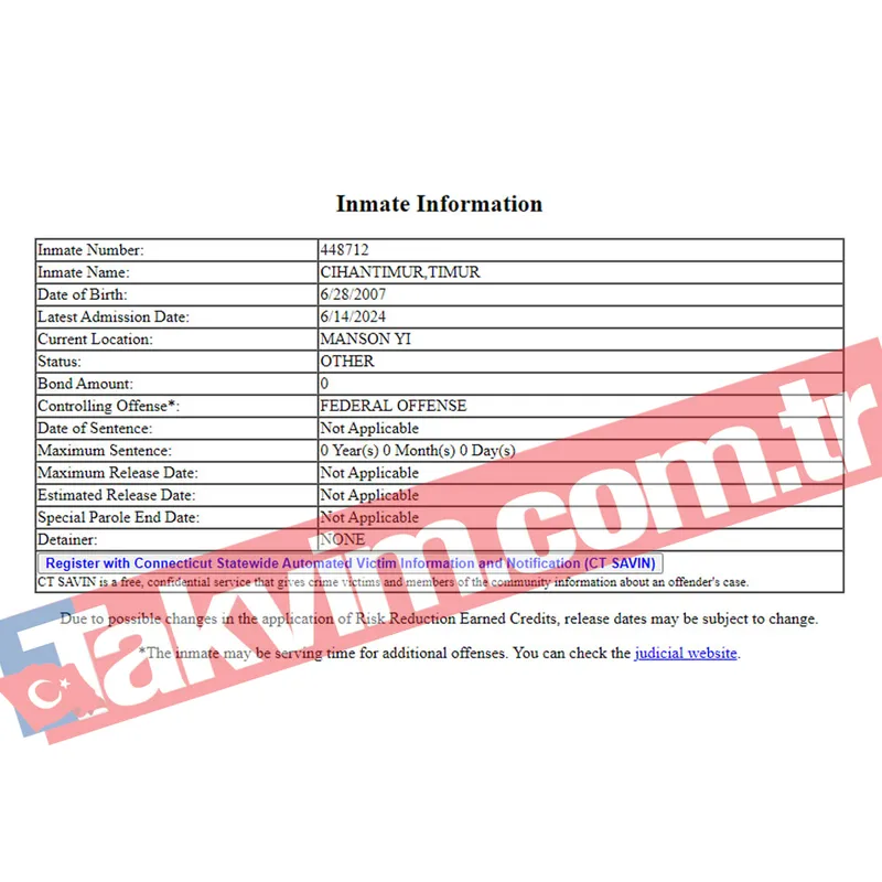 Öte yandan 'mahkum' bilgilerine ulaşılan Timur Cihantimur'un hapishane kayıtlarında 'federal suçlu' olarak nitelendirildiği görüldü.