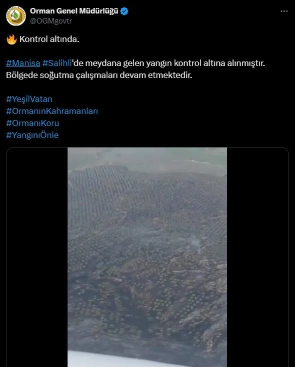 Orman Genel Müdürlüğü'nün sosyal medya hesabından yapılan açıklamaya göre, Manisa Salihli'deki yangın kontrol altına alındı. Yapılan açıklamada soğutma çalışmalarının devam ettiği bildirildi.