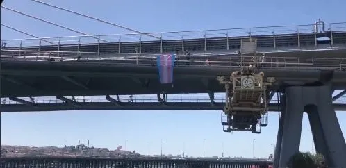 Sapkınların en büyük destekçisi haline gelen DEM Partili Özgül Saki ve Kezban Konukçu sözde "Onur Haftası" kapsamında Haliç Metro Köprüsü'ne trans bayrağı astı.