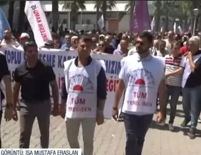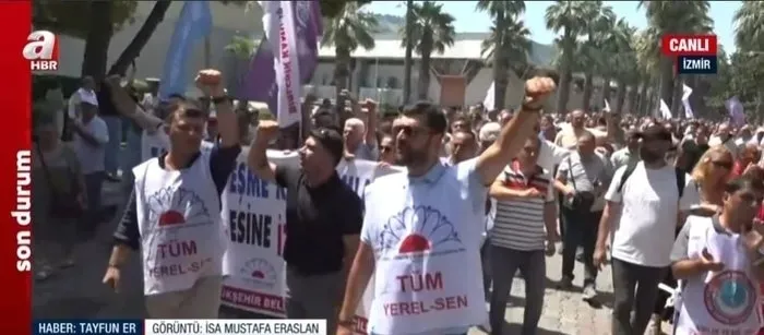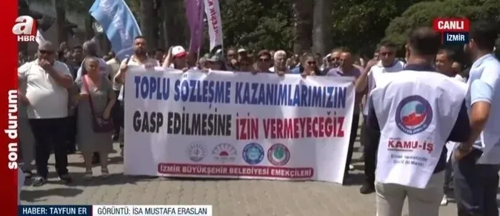 "Toplu sözleşme kazanımlarımızın gasp edilmesine izin vermeyeceğiz" yazılı pankart taşıyan sendika üyeleri, İzmir Büyükşehir Belediye Başkanı Cemil Tugay'ın Fuar Kültürpark Alanı'nda bulunan çalışma ofisine kadar yürüdü.