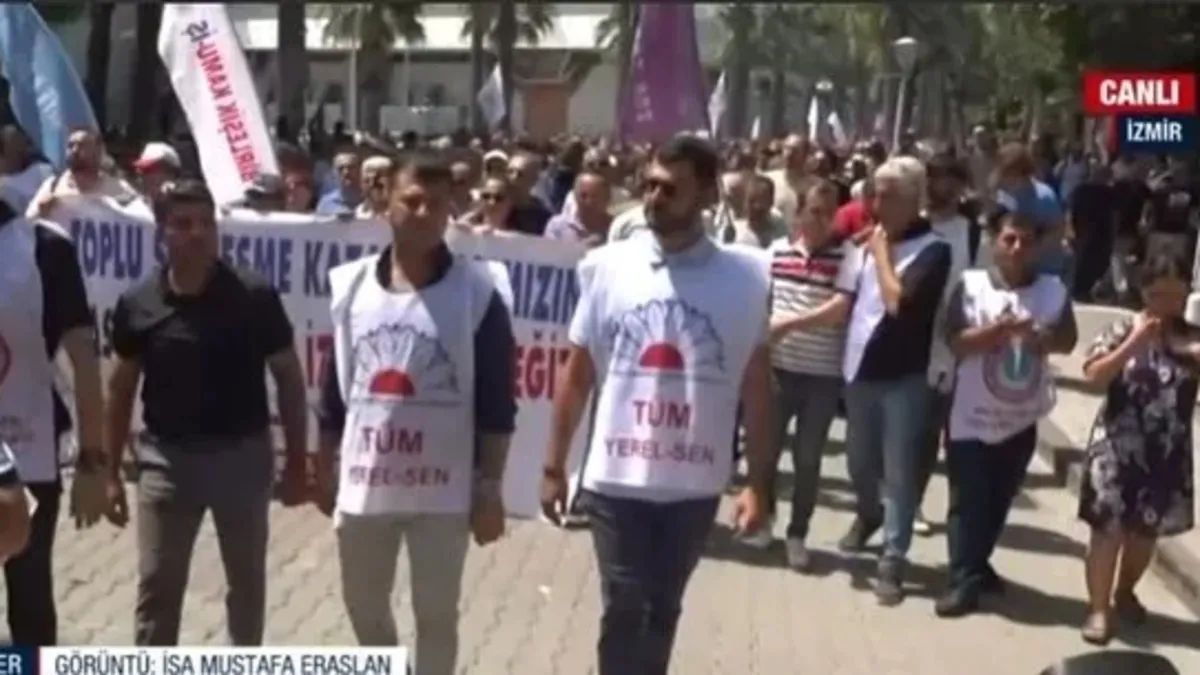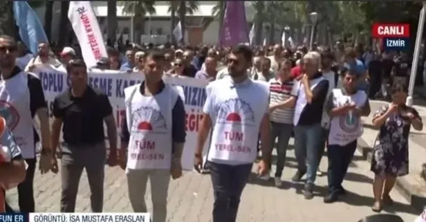 "Toplu sözleşme kazanımlarımızın gasp edilmesine izin vermeyeceğiz"yazılı pankart taşıyan sendika üyeleri, İzmir Büyükşehir Belediye Başkanı Cemil Tugay'ın Fuar Kültürpark Alanı'nda bulunan çalışma ofisine kadar yürüdü.