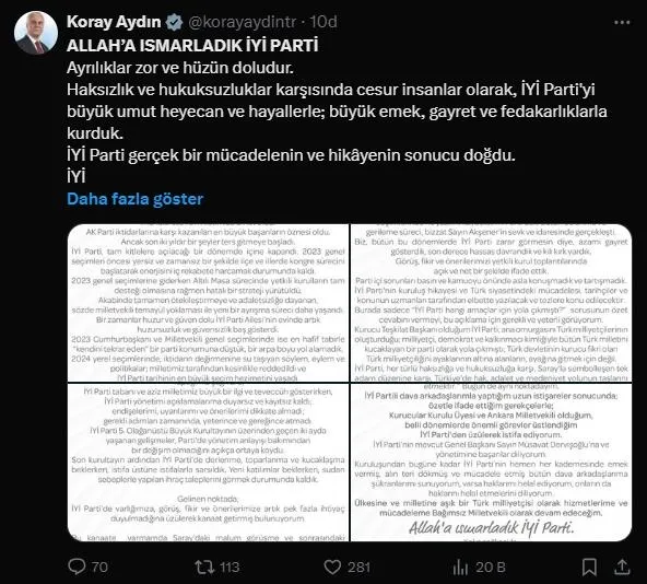 Aydın, sosyal medya hesabından yaptığı açıklamada İYİ Partinin büyük umut, heyecan, hayal; büyük emek, gayret ve fedakarlıklarla kurulduğunu ancak son iki yıldır bir şeylerin ters gitmeye başladığını kaydetti.