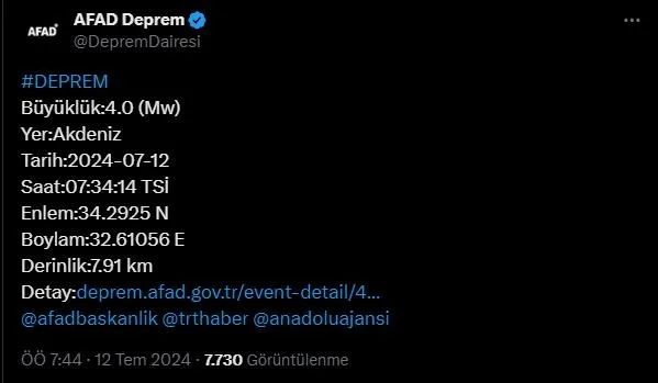 Son dakika haberi! Bugün sabah saatlerinde Akdeniz'de 4.0 büyüklüğünde bir deprem meydana geldi. AFAD depremin derinliğinin 7.91 km olarak ölçüldüğünü bildirdi.