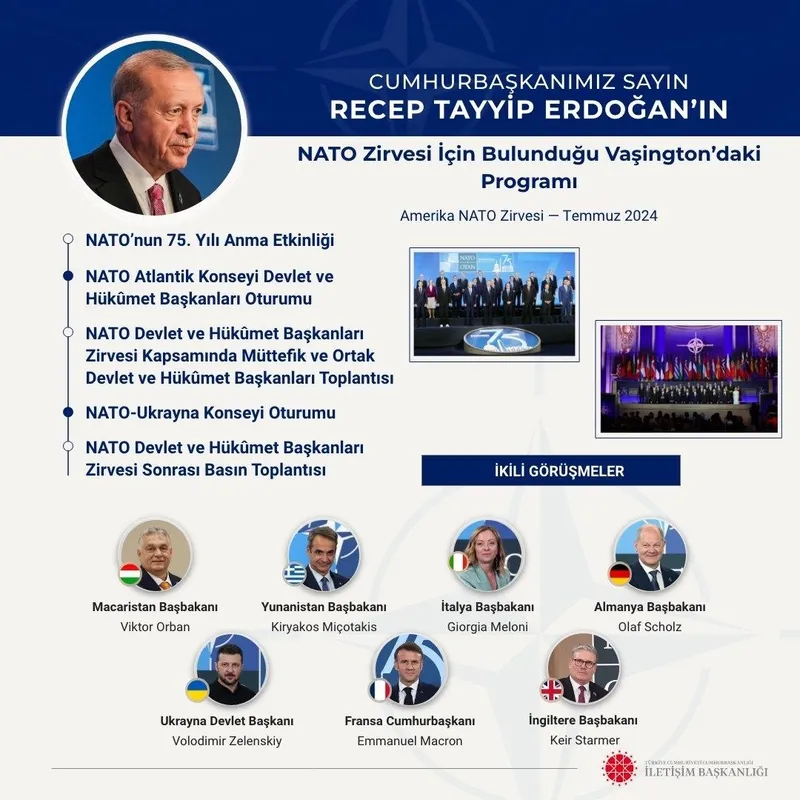 ABD'nin başkenti Washington'daki NATO Devlet ve Hükümet Başkanları Zirvesi'ne katılan Erdoğan, zirve temasları kapsamında bir dizi ikili görüşme gerçekleştirdi. Erdoğan, Fransa Cumhurbaşkanı Macron, Ukrayna Devlet Başkanı Zelenskiy, İngiltere Başbakanı Starmer ve Almanya Başbakanı Scholz'un da aralarında olduğu liderlerle ikili ilişkilerin yanı sıra bölgesel ve küresel konuları görüştü.