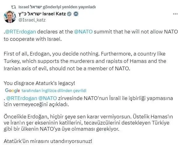 Başkan Recep Tayyip Erdoğan, NATO Liderler Zirvesi'nde İsrail'e sert sözlerle yüklendi. Başkan Erdoğan yaptığı açıklamada, "İttifakımızın temel değerlerini ayaklar altına alan İsrail yönetiminin NATO'yla ortaklık ilişkisini sürdürmesi mümkün değildir." ifadelerini kullandı. Bu sözler üzerine rahatsız olan terör devleti İsrail'in Dışişleri Bakanı Yisrael Katz, sosyal medya hesabından yaptığı Türkçe paylaşımla Başkan Erdoğan'ı hadsiz sözlerle hedef aldı. Siyonist Bakan Katz'ın Başkan Recep Tayyip Erdoğan ile ilgili paylaşımına Dışişleri Bakanlığı'ndan cevap gecikmedi. Bakanlık, "Bu tarz beyanların, bölgemizin gerçek gündemini değiştirmesine izin vermeyeceğiz." ifadeleri ile sert tepki gösterdi.