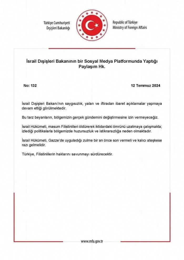"İsrail Dışişleri Bakanı'nın saygısızlık, yalan ve iftiradan ibaret açıklamalar yapmaya devam ettiği görülmektedir.