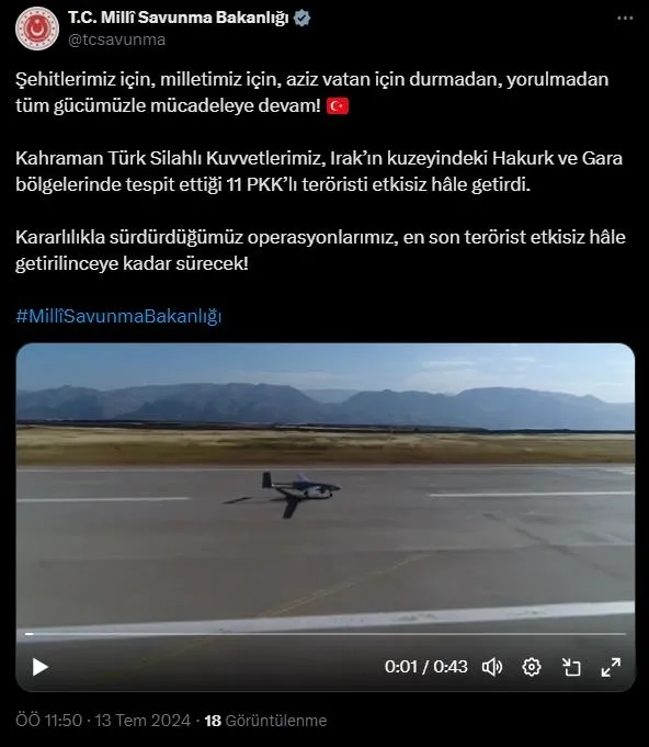 Kahraman Türk Silahlı Kuvvetlerimiz, Irak'ın kuzeyindeki Hakurk ve Gara bölgelerinde tespit ettiği 11 PKK'lı teröristi etkisiz hâle getirdi.