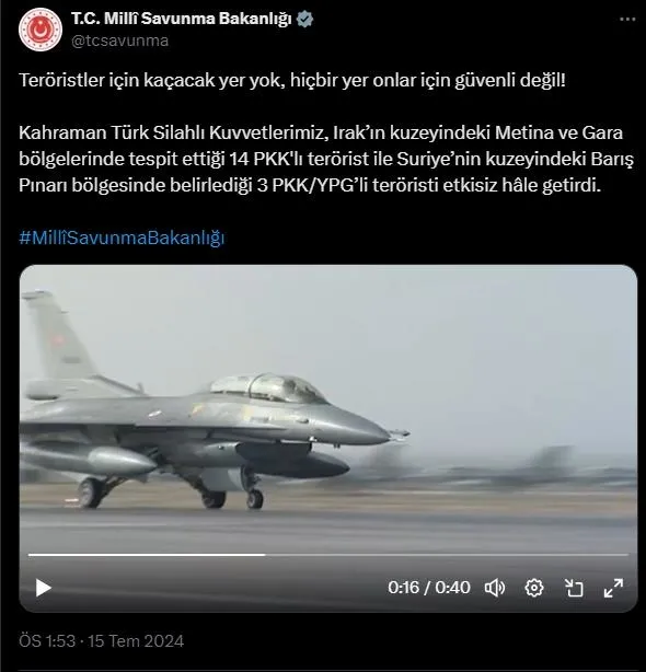 Milli Savunma Bakanlığı, Irak'ın ve Suriye'nin kuzeyinde 17 PKK/YPG'li teröristin etkisiz hale getirildiğini bildirdi.