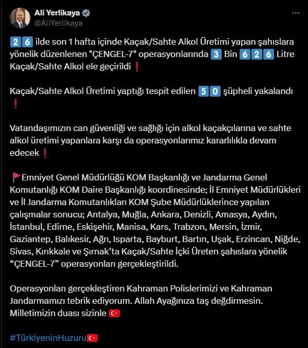 Bakan Yerlikaya, sosyal medya hesabından yaptığı açıklamada, Emniyet Genel Müdürlüğü KOM Başkanlığı ve Jandarma Genel Komutanlığı KOM Daire Başkanlığı koordinesinde; il emniyet müdürlükleri ve il jandarma komutanlıkları KOM şube müdürlüklerince yapılan çalışmalar sonucu Antalya, Muğla, Ankara, Denizli, Amasya, Aydın, İstanbul, Edirne, Eskişehir, Manisa, Kars, Trabzon, Mersin, İzmir, Gaziantep, Balıkesir, Ağrı, Isparta, Bayburt, Bartın, Uşak, Erzincan, Niğde, Sivas, Kırıkkale ve Şırnak'ta kaçak ve sahte alkol üretimi yapanlara yönelik "Çengel-7" operasyonları düzenlendiğini belirtti.