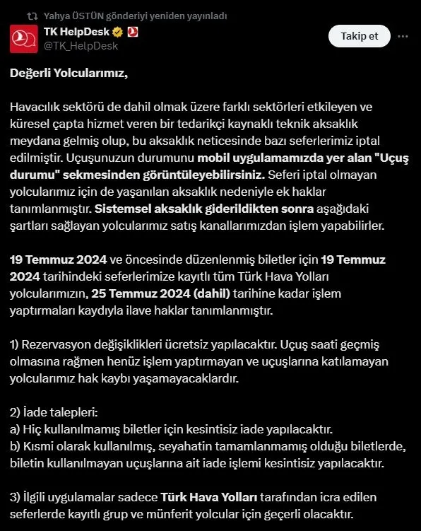 "Havacılık sektörü de dahil olmak üzere farklı sektörleri etkileyen ve küresel çapta hizmet veren bir tedarikçi kaynaklı teknik aksaklık meydana gelmiş olup, bu aksaklık neticesinde bazı seferlerimiz iptal edilmiştir. Uçuşunuzun durumunu mobil uygulamamızda yer alan "Uçuş durumu" sekmesinden görüntüleyebilirsiniz. Seferi iptal olmayan yolcularımız için de yaşanılan aksaklık nedeniyle ek haklar tanımlanmıştır. Sistemsel aksaklık giderildikten sonra aşağıdaki şartları sağlayan yolcularımız satış kanallarımızdan işlem yapabilirler.