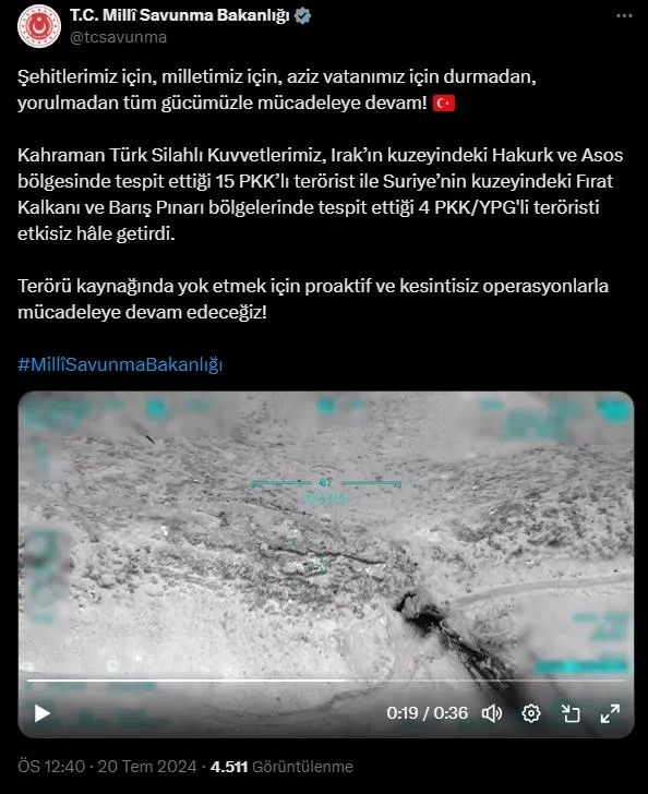 "Şehitlerimiz için, milletimiz için, aziz vatanımız için durmadan, yorulmadan tüm gücümüzle mücadeleye devam. Kahraman Türk Silahlı Kuvvetlerimiz, Irak'ın kuzeyindeki Hakurk ve Asos bölgesinde tespit ettiği 15 PKK'lı terörist ile Suriye'nin kuzeyindeki Fırat Kalkanı ve Barış Pınarı bölgelerinde tespit ettiği 4 PKK/YPG'li teröristi etkisiz hale getirdi. Terörü kaynağında yok etmek için proaktif ve kesintisiz operasyonlarla mücadeleye devam edeceğiz."