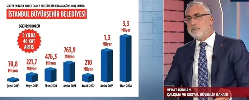 Bakan Işıkhan'ın canlı yayında SGK'ya en fazla borcu olan 5 belediyenin yıllara göre borç grafiğini de paylaştı. Tabloda CHP'li İBB'nin SGK prim borçlarının 5 yılda 46 kat artış gösterdiği görüldü.