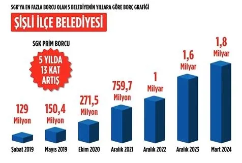 CHP tarafından yönetilen ve 1.8 milyar TL borcu bulunan Şişli Belediyesi'nin SGK prim borçlarının 5 yılda 13 kat artış gösterdiği tespit edildi.